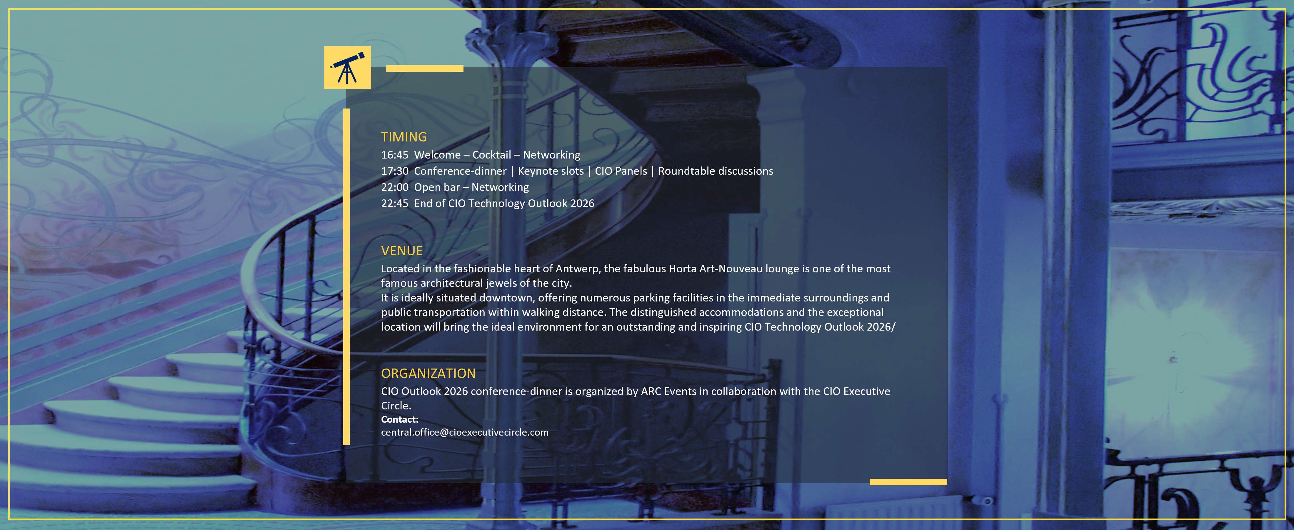 Real-world insights, objective opinions and facts-based views from top industry experts and forward-thinking CIOs are the fundamental pillar of the CIO Technology Outlook conference-dinner. Designed to be highly content-rich and time effective, the agenda will stress out, among others: